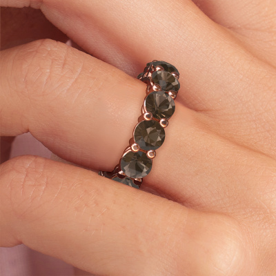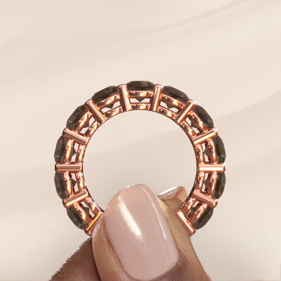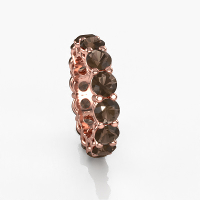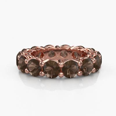 This is our Michelle full 5.0 ring. This specific type is called an eternity ring and it is set with a continuous line of identically cut gemstones. The ring is made in 14 Carat rose gold and is set with small smokey quartz, 5 mm. The amazing smokey quartz are identical in size and are set in the ring band. Our smokey quartz are selected with great care so they are identical, which gives the best result. In order to get the best result, our artisans position all smokey quartz by hand with the utmost care. Our Goldsmiths have one ambition, which is creating the perfect ring. That is why we love what we do. In the end you get a stunning exclusive rose gold stackable ring with a row of smokey quartz which seem to have no beginning nor end. The perfect symbol of your undying love for her! How special is that!By using a combination of the latest modern techniques, combined with ancient crafting, we can make all our rings in our own studio. Each jewel is made to order. This is advantageous because we can offer you a price you won't find anywhere else.New jewelry designs are added to our online collection daily. Our team of passionate designers strive to create extraordinary and diverse designs. Have you seen a ring you like? Please feel free to contact us. Based on a good price/ quality ratio, we will make you an offer you can't refuse!To make it easier for you, we offer a 30 day return policy. Check our terms and conditions.