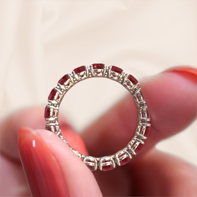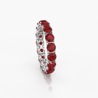 This is our Vivienne 3.7 ring. This specific type is called an eternity ring and it is set with a continuous line of identically cut gemstones. The ring is made in 14 Carat white gold and is set with small ruby, 3.7 mm. The amazing ruby are identical in size and are set in the ring band. Our ruby are selected with great care so they are identical, which gives the best result. In order to get the best result, our artisans position all ruby by hand with the utmost care. Our Goldsmiths have one ambition, which is creating the perfect ring. That is why we love what we do. In the end you get a stunning classic white gold stackable ring with a row of ruby which seem to have no beginning nor end. The perfect symbol of your undying love for her! How special is that!After receiving your order, our goldsmiths will start the creative process of making your Vivienne 3.7 ring. We don't keep stock. This is advantageous because these costs will not be passed on to you. Therefore, we can offer jewelry at exceptionally low prices.New jewelry designs are added to our online collection daily. Our team of passionate designers strive to create extraordinary and diverse designs. Have you seen a ring you like? Please feel free to contact us. Based on a good price/ quality ratio, we will make you an offer you can't refuse!To make it easier for you, we offer a 30 day return policy. Check our terms and conditions.