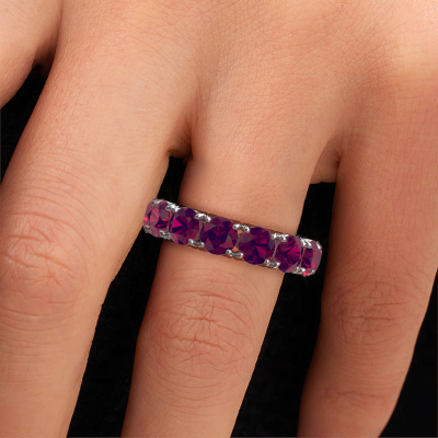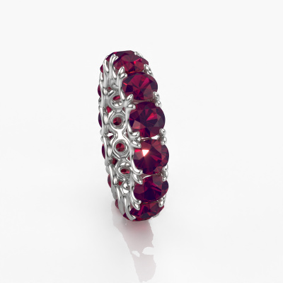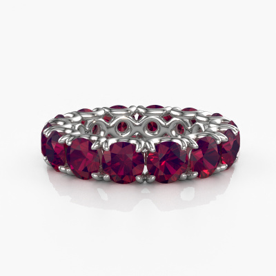 This is our Estee 5.0 ring. This specific type is called an eternity ring and it is set with a continuous line of identically cut gemstones. The ring is made in 14 Carat white gold and is set with small rhodolite, 5 mm. The amazing rhodolite are identical in size and are set in the ring band. Our rhodolite are selected with great care so they are identical, which gives the best result. In order to get the best result, our artisans position all rhodolite by hand with the utmost care. Our Goldsmiths have one ambition, which is creating the perfect ring. That is why we love what we do. In the end you get a stunning exclusive white gold ring with a row of rhodolite which seem to have no beginning nor end. The perfect symbol of your undying love for her! How special is that!Are you on a budget? Please feel free to contact us, so we can go discuss your options. We offer our rings at guaranteed best price, because we make them to order. You won't find such a price anywhere else!Our talented designers add new designs to our online collection daily. Together they create a diverse collection of the finest jewelry. If you prefer to make a ring according your own design, please feel free to request a quote. We will make you an amazing offer, based on quality and price.To make it easier for you, we offer a 30 day return policy. Check our terms and conditions.