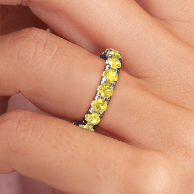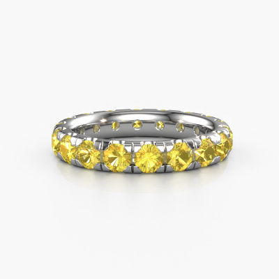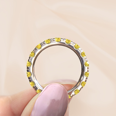 This is our Jackie 3.4 ring. This specific type is called an eternity ring and it is set with a continuous line of identically cut gemstones. The ring is made in platinum and is set with small yellow sapphire, 3.4 mm. This platinum Eternity ring is a perfectly beautiful and meaningful way to give your proposal that special touch. The magnificent evenly shaped yellow sapphire are pave set around the ring. The identical yellow sapphire are carefully selected to give the ring a maximum effect. Do keep in mind we use natural resources so small differences between stones are common. The special effect is enhanced due to precise positioning of the yellow sapphire. This requires the utmost precision and a skillful hand but for our skilled artisans this is what excites them. The result is a stackable ring with a row of yellow sapphire which seem to have no beginning nor end. The perfect symbol of your love for her! Isn't she a beauty?After receiving your order, our goldsmiths will passionately start the creative process of making your ring in our own studio. Because we don't have a big stockpile, these costs will not be passed on to you. Our pricing is proof of that! We offer top quality jewels at lowest price, guaranteed.Our talented designers add new designs to our online collection daily. Together they create a diverse collection of the finest jewelry. If you prefer to make a ring according your own design, please feel free to request a quote. We will make you an amazing offer, based on quality and price.To make it easier for you, we offer a 30 day return policy. Check our terms and conditions.