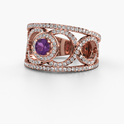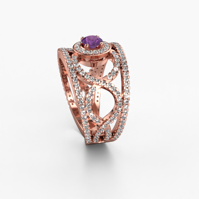 This exclusive rose gold Regina ring is a true work of art! This ring is made of 14 Carat rose gold and is set with 4.2 mm round amethyst. The smallest ornaments are crafted by our goldsmith with a lot of patience and great passion. In order to create this ring with great precision, this craft requires a keen eye and a skillful hand. A challenge which ignites a fire in our expert goldsmiths. The exquisite amethysten are set in a way that their unique qualities are strengthened. This gives the ring an even more glamorous appearance. The ring is unique by itself though, because of the natural birthstones we selected especially for this Regina ring. And by choosing the precious metal yourself, you create a unique ring. How do you like this exclusive rose gold ring? Simply customize this Regina ring, using our online tool. Subsequently, your personal special Regina ring will be made by hand by our goldsmiths. Precious metals and gemstones can be customized to your liking. Do you have specific preferences which are unavailable in our online tool? Please feel free to contact us. We will customize your personal exclusive ring to your liking.By using our modern techniques, we can design and customize the finest quality jewels with the utmost care for you. Our rings are always priced 30 percent lower than other jewelers. We make rings to order, so we don't have to maintain a large stock. If you have a certain budget, we are more than happy to advice you accordingly.To make it easier for you, we offer a 30 day return policy. Check our terms and conditions.