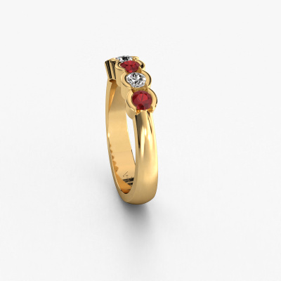 This ring is called Lotte 5. It is made of 14 Carat gold and is set with 3 mm ruby. Are you looking for a unique gold ring with a modern appearance? Then this is the ring for you. Simply customize to your or her liking. Perfect for a modern, contemporary woman! This 5 stones ring is adorned with stunning ruby. It was carefully selected because your ring must be adorned with nothing but the most beautiful gemstones. Our expert goldsmith will create your ring in our own studio, where the ruby will be set with great care. The ring will then be polished to perfection to create a beautiful ring. By using a combination of the latest modern techniques, combined with ancient crafting, we can make all our rings in our own studio. Each jewel is made to order. This is advantageous because we can offer you a price you won't find anywhere else.Our team of talented, passionate designers add new ring designs to our online collection daily. Our objective in doing so, is to be able to offer you a wide variety of jewels. Please feel free to request a quote if you have specific wishes for your ring. We guarantee to make you an offer you can't refuse.To make it easier for you, we offer a 30 day return policy. Check our terms and conditions.
