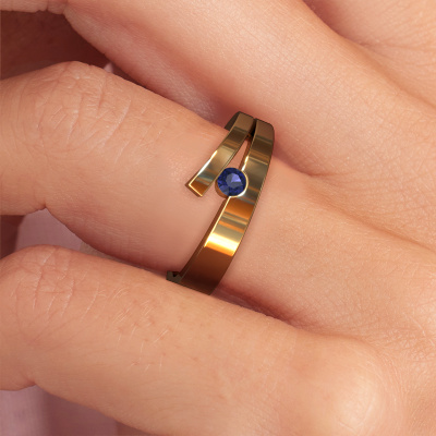 This ring is called Rosario. It is made of 14 Carat gold and is set with 3 mm sapphire. Are you looking for a unique gold ring with a modern appearance? Then this is the ring for you. Simply customize to your or her liking. Perfect for a modern, contemporary woman! This edgy ring is adorned with stunning sapphire. It was carefully selected because your ring must be adorned with nothing but the most beautiful gemstones. Our expert goldsmith will create your ring in our own studio, where the sapphire will be set with great care. The ring will then be polished to perfection to create a beautiful ring. Are you on a budget? Please feel free to contact us, so we can go discuss your options. We offer our rings at guaranteed best price, because we make them to order. You won't find such a price anywhere else!