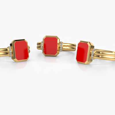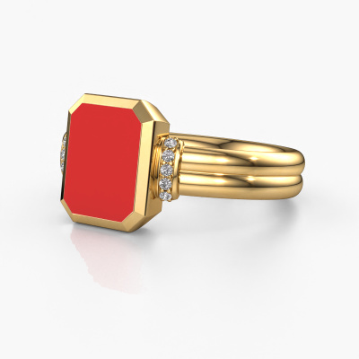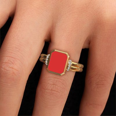 This gold women´s signet ring is a true work of art! This is our contemporary Gwenn 3 signet ring and it is set with a octagon red enamel. In our crafting studio, we use a combination of the latest techniques and ancient traditional craftsmanship, so we are able to create a detailed perfect signet ring. Our expert goldsmiths are fascinated by signet rings. The signet ring can be engraved with initials or a family weapon. Signet rings with family weapons can be handed down from generation to generation and that usually is the case. On top of that, a signet ring is a beautiful, classy piece of jewelry which is trending once more. More than one reason to start or extend the tradition. Please browse our online database for more options on engravings. You can find the departments of our education center at the bottom of this page. The contemporary Gwenn 3 signet ring, as shown here, can be customized to your liking. Our online tool offers many different options but please feel free to contact us if you want changes made to your Gwenn 3 signet ring, which are unavailable in our online tool.By using a combination of the latest modern techniques, combined with ancient crafting, we can make all our rings in our own studio. Each jewel is made to order. This is advantageous because we can offer you a price you won't find anywhere else.To make it easier for you, we offer a 30 day return policy. Check our terms and conditions.