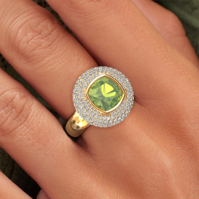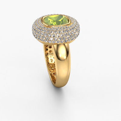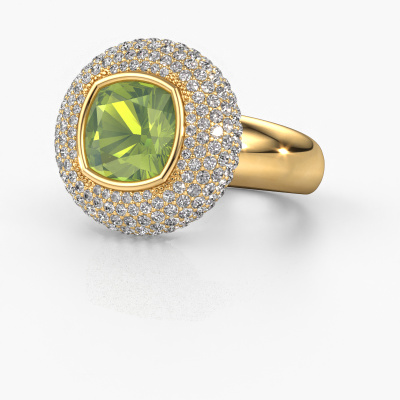 This exclusive gold Keshia ring is a true work of art! This ring is made of 14 Carat gold and is set with 8 mm cushion peridot. The smallest ornaments are crafted by our goldsmith with a lot of patience and great passion. In order to create this ring with great precision, this craft requires a keen eye and a skillful hand. A challenge which ignites a fire in our expert goldsmiths. The exquisite peridot are set in a way that their unique qualities are strengthened. This gives the ring an even more glamorous appearance. The ring is unique by itself though, because of the natural birthstones we selected especially for this Keshia ring. And by choosing the precious metal yourself, you create a unique ring. Our goldsmiths passionately create your customized ring to your liking with the utmost care. The gold ring, as shown here, can be customized using our online tool. Feel free to ask our jewel designers for assistance if you want changes made which are unavailable in our online tool. We are happy to answer your questions.By using our modern techniques, we can design and customize the finest quality jewels with the utmost care for you. Our rings are always priced 30 percent lower than other jewelers. We make rings to order, so we don't have to maintain a large stock. If you have a certain budget, we are more than happy to advice you accordingly.To make it easier for you, we offer a 30 day return policy. Check our terms and conditions.