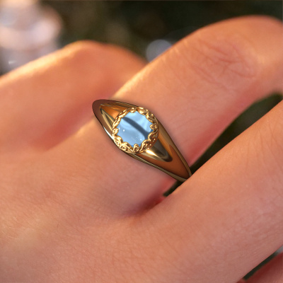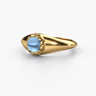 In this photo the gold Birgit ring is set with a cabochon blue topaz. Cabochon means a blue topaz is shaped first, not faceted, into a specific shape, such as a drop, heart or round cabochon. Subsequently, it is polished until the gemstone has a orb shaped surface. A cabochon gemstone is a stunning, classy eye-catcher that matches perfectly with a contemporary as well as a vintage style. Our expert goldsmiths shape the royal ring to perfection which makes it unique. The cabochon blue topaz is set so its unique qualities are strengthened. The royal Birgit ring, as shown here, can be customized to your liking. Our online tool offers many different options but please feel free to contact us if you want changes made to your Birgit ring, which are unavailable in our online tool.Because we design and deliver our own rings, we can offer you a ring at a price you won't find anywhere else. A ring is made to order, which helps prevent excess supplies, so we can make you a great price offer. We understand it feels risky, buying your ring online, but we will gladly assist in the designing process, taking your budget into consideration.To make it easier for you, we offer a 30 day return policy. Check our terms and conditions.