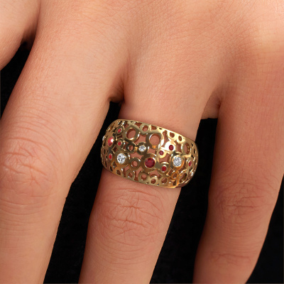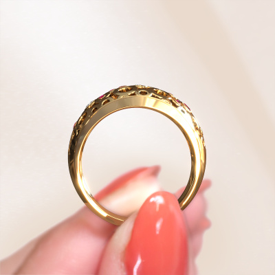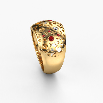 How would you describe your own style? Are you looking for something uniquely different? This wide gold Jaylinn ring is astonishing! Simply customize to your or her own liking. This ring is set with ruby. These ruby have been carefully selected because your ring must be adorned with nothing but the most beautiful gemstone. Wouldn't you agree? Our expert goldsmith will create your ring in our own crafting studios, where the ruby will be set with care. The ring will then be polished to perfection to give it that extra sparkle. It's a perfect ring for a woman of excellent taste!How do you like this fantasy gold ring? Simply customize this Jaylinn ring, using our online tool. Subsequently, your personal wide Jaylinn ring will be made by hand by our goldsmiths. Precious metals and gemstones can be customized to your liking. Do you have specific preferences which are unavailable in our online tool? Please feel free to contact us. We will customize your personal fantasy ring to your liking.By using our modern techniques, we can design and customize the finest quality jewels with the utmost care for you. Our rings are always priced 30 percent lower than other jewelers. We make rings to order, so we don't have to maintain a large stock. If you have a certain budget, we are more than happy to advice you accordingly.To make it easier for you, we offer a 30 day return policy. Check our terms and conditions.