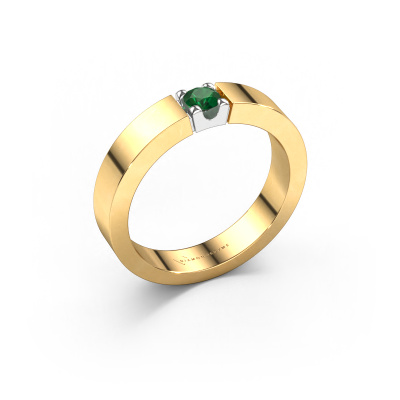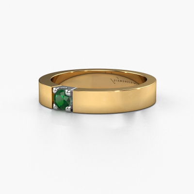 This extraordinary ring is called Dana 1. This type of ring is known as a memoire ring, because it's birthstones are set in a continuous line. This makes it easy to combine with other rings. The band of this 14 Carat gold ring is set in a combination of emerald and emerald 3.7 mm. You can easily choose the combination you prefer online. As you can see, a single emerald is set in this single alliance gold ring. The memoire ring represents collaboration. And that is precisely what these gemstones do, collaborate. Together they add a beautiful effect to the band of a modern ring! Such a meaningful ring, wouldn't you agree? All of our hand selected emeralds are positioned by hand by our expert goldsmith. It's a precise task, which can only be completed successfully through the combination of pure craftsmanship and usage of the latest techniques which give it an optimal effect. To create a perfect reflection of light, all the gemstones have to be perfectly aligned in the same way. During manufacturing, the expert goldsmith will therefore monitor the reflection of light constantly to check whether the emeralds are aligned properly. This requires a skilled hand and a lot of patience but then the end product will be a true piece of art. And that is our mission!After receiving your order, our goldsmiths will passionately start the creative process of making your ring in our own studio. Because we don't have a big stockpile, these costs will not be passed on to you. Our pricing is proof of that! We offer top quality jewels at lowest price, guaranteed.Our team of talented, passionate designers add new ring designs to our online collection daily. Our objective in doing so, is to be able to offer you a wide variety of jewels. Please feel free to request a quote if you have specific wishes for your ring. We guarantee to make you an offer you can't refuse.To make it easier for you, we offer a 30 day return policy. Check our terms and conditions.