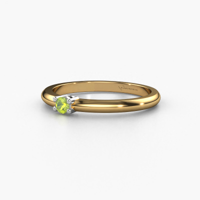This extraordinary ring is called Michelle 1. This type of ring is known as a memoire ring, because it's birthstones are set in a continuous line. This makes it easy to combine with other rings. The band of this 14 Carat gold ring is set in a combination of peridot and peridot 2.7 mm. You can easily choose the combination you prefer online. As you can see, a single peridot is set in this single alliance gold ring. The memoire ring represents collaboration. And that is precisely what these gemstones do, collaborate. Together they add a beautiful effect to the band of a classic ring! Such a meaningful ring, wouldn't you agree? All of our hand selected peridot are positioned by hand by our expert goldsmith. It's a precise task, which can only be completed successfully through the combination of pure craftsmanship and usage of the latest techniques which give it an optimal effect. To create a perfect reflection of light, all the gemstones have to be perfectly aligned in the same way. During manufacturing, the expert goldsmith will therefore monitor the reflection of light constantly to check whether the peridot are aligned properly. This requires a skilled hand and a lot of patience but then the end product will be a true piece of art. And that is our mission!By using a combination of the latest modern techniques, combined with ancient crafting, we can make all our rings in our own studio. Each jewel is made to order. This is advantageous because we can offer you a price you won't find anywhere else.