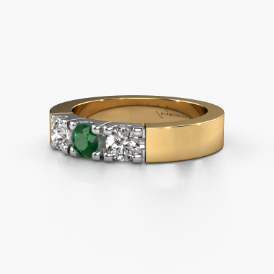 This extraordinary ring is called Dana 3. This type of ring is known as a memoire ring, because its gemstones are set in a continuous line. This makes it easy to combine with other rings. The band of this 14 Carat gold ring is set in a combination of emerald and lab-grown diamond 4 mm. You can easily choose the combination you prefer online. As you can see, a single emerald is set in this single alliance gold ring. The memoire ring represents collaboration. And that is precisely what these gemstones do, collaborate. Together they add a beautiful effect to the band of a modern ring! Such a meaningful ring, wouldn't you agree? All of our hand selected emeralds are positioned by hand by our expert goldsmith. It's a precise task, which can only be completed successfully through the combination of pure craftsmanship and usage of the latest techniques which give it an optimal effect. To create a perfect reflection of light, all the gemstones have to be perfectly aligned in the same way. During manufacturing, the expert goldsmith will therefore monitor the reflection of light constantly to check whether the emeralds are aligned properly. This requires a skilled hand and a lot of patience but then the end product will be a true piece of art. And that is our mission!After receiving your order, our goldsmiths will passionately start the creative process of making your ring in our own studio. Because we don't have a big stockpile, these costs will not be passed on to you. Our pricing is proof of that! We offer top quality jewels at lowest price, guaranteed.Our talented designers add new designs to our online collection daily. Together they create a diverse collection of the finest jewelry. If you prefer to make a ring according your own design, please feel free to request a quote. We will make you an amazing offer, based on quality and price.To make it easier for you, we offer a 30 day return policy. Check our terms and conditions.