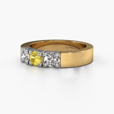 This extraordinary ring is called Dana 3. This type of ring is known as a memoire ring, because its gemstones are set in a continuous line. This makes it easy to combine with other rings. The band of this 14 Carat gold ring is set in a combination of yellow sapphire and lab-grown diamond 4 mm. You can easily choose the combination you prefer online. As you can see, a single yellow sapphire is set in this single alliance gold ring. The memoire ring represents collaboration. And that is precisely what these gemstones do, collaborate. Together they add a beautiful effect to the band of a modern ring! Such a meaningful ring, wouldn't you agree? All of our hand selected yellow sapphire are positioned by hand by our expert goldsmith. It's a precise task, which can only be completed successfully through the combination of pure craftsmanship and usage of the latest techniques which give it an optimal effect. To create a perfect reflection of light, all the gemstones have to be perfectly aligned in the same way. During manufacturing, the expert goldsmith will therefore monitor the reflection of light constantly to check whether the yellow sapphire are aligned properly. This requires a skilled hand and a lot of patience but then the end product will be a true piece of art. And that is our mission!After receiving your order, our goldsmiths will passionately start the creative process of making your ring in our own studio. Because we don't have a big stockpile, these costs will not be passed on to you. Our pricing is proof of that! We offer top quality jewels at lowest price, guaranteed.Our talented designers add new designs to our online collection daily. Together they create a diverse collection of the finest jewelry. If you prefer to make a ring according your own design, please feel free to request a quote. We will make you an amazing offer, based on quality and price.To make it easier for you, we offer a 30 day return policy. Check our terms and conditions.