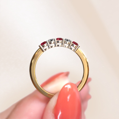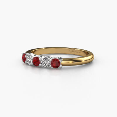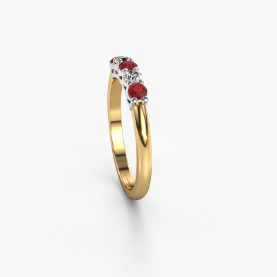 This extraordinary ring is called Michelle 5. This type of ring is known as a memoire ring, because its gemstones are set in a continuous line. This makes it easy to combine with other rings. The band of this 14 Carat gold ring is set in a combination of ruby and lab-grown diamond 3 mm. You can easily choose the combination you prefer online. As you can see, a single ruby is set in this single alliance gold ring. The memoire ring represents collaboration. And that is precisely what these gemstones do, collaborate. Together they add a beautiful effect to the band of a classic ring! Such a meaningful ring, wouldn't you agree? All of our hand selected ruby are positioned by hand by our expert goldsmith. It's a precise task, which can only be completed successfully through the combination of pure craftsmanship and usage of the latest techniques which give it an optimal effect. To create a perfect reflection of light, all the gemstones have to be perfectly aligned in the same way. During manufacturing, the expert goldsmith will therefore monitor the reflection of light constantly to check whether the ruby are aligned properly. This requires a skilled hand and a lot of patience but then the end product will be a true piece of art. And that is our mission!Are you on a budget? Please feel free to contact us, so we can go discuss your options. We offer our rings at guaranteed best price, because we make them to order. You won't find such a price anywhere else!