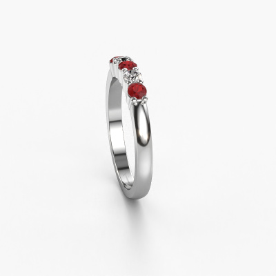 This extraordinary ring is called Yasmin 5. This type of ring is known as a memoire ring, because its gemstones are set in a continuous line. This makes it easy to combine with other rings. The band of this platinum ring is set in a combination of ruby and diamond 3 mm. You can easily choose the combination you prefer online. As you can see, a single ruby is set in this single alliance platinum ring. The memoire ring represents collaboration. And that is precisely what these gemstones do, collaborate. Together they add a beautiful effect to the band of a classic ring! Such a meaningful ring, wouldn't you agree? All of our hand selected ruby are positioned by hand by our expert goldsmith. It's a precise task, which can only be completed successfully through the combination of pure craftsmanship and usage of the latest techniques which give it an optimal effect. To create a perfect reflection of light, all the gemstones have to be perfectly aligned in the same way. During manufacturing, the expert goldsmith will therefore monitor the reflection of light constantly to check whether the ruby are aligned properly. This requires a skilled hand and a lot of patience but then the end product will be a true piece of art. And that is our mission!After receiving your order, our goldsmiths will passionately start the creative process of making your ring in our own studio. Because we don't have a big stockpile, these costs will not be passed on to you. Our pricing is proof of that! We offer top quality jewels at lowest price, guaranteed.Our talented designers add new designs to our online collection daily. Together they create a diverse collection of the finest jewelry. If you prefer to make a ring according your own design, please feel free to request a quote. We will make you an amazing offer, based on quality and price.To make it easier for you, we offer a 30 day return policy. Check our terms and conditions.