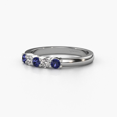 This extraordinary ring is called Yasmin 5. This type of ring is known as a memoire ring, because its gemstones are set in a continuous line. This makes it easy to combine with other rings. The band of this platinum ring is set in a combination of sapphire and diamond 3 mm. You can easily choose the combination you prefer online. As you can see, a single sapphire is set in this single alliance platinum ring. The memoire ring represents collaboration. And that is precisely what these gemstones do, collaborate. Together they add a beautiful effect to the band of a classic ring! Such a meaningful ring, wouldn't you agree? All of our hand selected sapphire are positioned by hand by our expert goldsmith. It's a precise task, which can only be completed successfully through the combination of pure craftsmanship and usage of the latest techniques which give it an optimal effect. To create a perfect reflection of light, all the gemstones have to be perfectly aligned in the same way. During manufacturing, the expert goldsmith will therefore monitor the reflection of light constantly to check whether the sapphire are aligned properly. This requires a skilled hand and a lot of patience but then the end product will be a true piece of art. And that is our mission!After receiving your order, our goldsmiths will passionately start the creative process of making your ring in our own studio. Because we don't have a big stockpile, these costs will not be passed on to you. Our pricing is proof of that! We offer top quality jewels at lowest price, guaranteed.Our talented designers add new designs to our online collection daily. Together they create a diverse collection of the finest jewelry. If you prefer to make a ring according your own design, please feel free to request a quote. We will make you an amazing offer, based on quality and price.To make it easier for you, we offer a 30 day return policy. Check our terms and conditions.