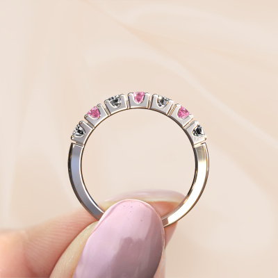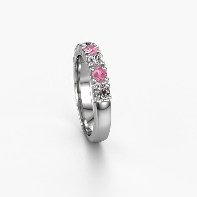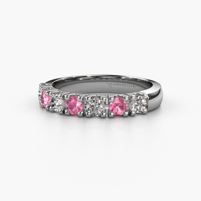 This extraordinary ring is called Rianne 7. This type of ring is known as a memoire ring, because its gemstones are set in a continuous line. This makes it easy to combine with other rings. The band of this platinum ring is set in a combination of pink sapphire and lab-grown diamond 3 mm. You can easily choose the combination you prefer online. As you can see, a single pink sapphire is set in this single alliance platinum ring. The memoire ring represents collaboration. And that is precisely what these gemstones do, collaborate. Together they add a beautiful effect to the band of a traditional ring! Such a meaningful ring, wouldn't you agree? All of our hand selected pink sapphire are positioned by hand by our expert goldsmith. It's a precise task, which can only be completed successfully through the combination of pure craftsmanship and usage of the latest techniques which give it an optimal effect. To create a perfect reflection of light, all the gemstones have to be perfectly aligned in the same way. During manufacturing, the expert goldsmith will therefore monitor the reflection of light constantly to check whether the pink sapphire are aligned properly. This requires a skilled hand and a lot of patience but then the end product will be a true piece of art. And that is our mission!Because we design and deliver our own rings, we can offer you a ring at a price you won't find anywhere else. A ring is made to order, which helps prevent excess supplies, so we can make you a great price offer. We understand it feels risky, buying your ring online, but we will gladly assist in the designing process, taking your budget into consideration.