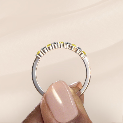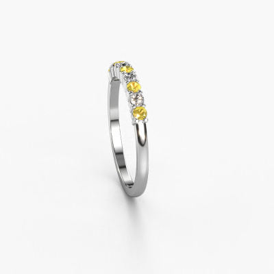 This extraordinary ring is called Yasmin 9. This type of ring is known as a memoire ring, because its gemstones are set in a continuous line. This makes it easy to combine with other rings. The band of this platinum ring is set in a combination of yellow sapphire and diamond 2.4 mm. You can easily choose the combination you prefer online. As you can see, a single yellow sapphire is set in this single alliance platinum ring. The memoire ring represents collaboration. And that is precisely what these gemstones do, collaborate. Together they add a beautiful effect to the band of a classic ring! Such a meaningful ring, wouldn't you agree? All of our hand selected yellow sapphire are positioned by hand by our expert goldsmith. It's a precise task, which can only be completed successfully through the combination of pure craftsmanship and usage of the latest techniques which give it an optimal effect. To create a perfect reflection of light, all the gemstones have to be perfectly aligned in the same way. During manufacturing, the expert goldsmith will therefore monitor the reflection of light constantly to check whether the yellow sapphire are aligned properly. This requires a skilled hand and a lot of patience but then the end product will be a true piece of art. And that is our mission!By using a combination of the latest modern techniques, combined with ancient crafting, we can make all our rings in our own studio. Each jewel is made to order. This is advantageous because we can offer you a price you won't find anywhere else.Our team of talented, passionate designers add new ring designs to our online collection daily. Our objective in doing so, is to be able to offer you a wide variety of jewels. Please feel free to request a quote if you have specific wishes for your ring. We guarantee to make you an offer you can't refuse.To make it easier for you, we offer a 30 day return policy. Check our terms and conditions.