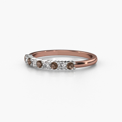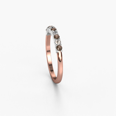 This extraordinary ring is called Yasmin 9. This type of ring is known as a memoire ring, because its gemstones are set in a continuous line. This makes it easy to combine with other rings. The band of this 14 Carat rose gold ring is set in a combination of smokey quartz and diamond 2.4 mm. You can easily choose the combination you prefer online. As you can see, a single smokey quartz is set in this single alliance rose gold ring. The memoire ring represents collaboration. And that is precisely what these gemstones do, collaborate. Together they add a beautiful effect to the band of a classic ring! Such a meaningful ring, wouldn't you agree? All of our hand selected smokey quartz are positioned by hand by our expert goldsmith. It's a precise task, which can only be completed successfully through the combination of pure craftsmanship and usage of the latest techniques which give it an optimal effect. To create a perfect reflection of light, all the gemstones have to be perfectly aligned in the same way. During manufacturing, the expert goldsmith will therefore monitor the reflection of light constantly to check whether the smokey quartz are aligned properly. This requires a skilled hand and a lot of patience but then the end product will be a true piece of art. And that is our mission!By using a combination of the latest modern techniques, combined with ancient crafting, we can make all our rings in our own studio. Each jewel is made to order. This is advantageous because we can offer you a price you won't find anywhere else.Our team of talented, passionate designers add new ring designs to our online collection daily. Our objective in doing so, is to be able to offer you a wide variety of jewels. Please feel free to request a quote if you have specific wishes for your ring. We guarantee to make you an offer you can't refuse.To make it easier for you, we offer a 30 day return policy. Check our terms and conditions.