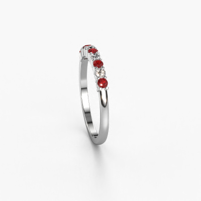 This extraordinary ring is called Yasmin 9. This type of ring is known as a memoire ring, because its gemstones are set in a continuous line. This makes it easy to combine with other rings. The band of this 14 Carat white gold ring is set in a combination of ruby and diamond 2.4 mm. You can easily choose the combination you prefer online. As you can see, a single ruby is set in this single alliance white gold ring. The memoire ring represents collaboration. And that is precisely what these gemstones do, collaborate. Together they add a beautiful effect to the band of a classic ring! Such a meaningful ring, wouldn't you agree? All of our hand selected ruby are positioned by hand by our expert goldsmith. It's a precise task, which can only be completed successfully through the combination of pure craftsmanship and usage of the latest techniques which give it an optimal effect. To create a perfect reflection of light, all the gemstones have to be perfectly aligned in the same way. During manufacturing, the expert goldsmith will therefore monitor the reflection of light constantly to check whether the ruby are aligned properly. This requires a skilled hand and a lot of patience but then the end product will be a true piece of art. And that is our mission!By using a combination of the latest modern techniques, combined with ancient crafting, we can make all our rings in our own studio. Each jewel is made to order. This is advantageous because we can offer you a price you won't find anywhere else.Our team of talented, passionate designers add new ring designs to our online collection daily. Our objective in doing so, is to be able to offer you a wide variety of jewels. Please feel free to request a quote if you have specific wishes for your ring. We guarantee to make you an offer you can't refuse.To make it easier for you, we offer a 30 day return policy. Check our terms and conditions.