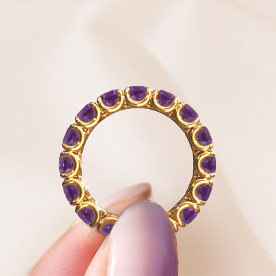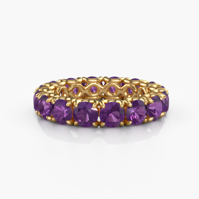 This Estee 4.2 ring in 14 Carat gold is set with amethyst. This gold stacked Estee 4.2 ring is the perfect addition to your ring collection! As the name suggests, it is a ring which can be combined on one finger with another ring. It gives you the opportunity to create your own style. A stacked ring usually represents a certain memory of someone special or a memorable moment. It is common to combine a stacked ring, representing an anniversary, with a wedding ring. But this eternity ring, combined with your other rings, also makes a classy fashion item. The eternity Estee 4.2 ring, as shown here, can be customized to your liking. Our online tool offers many different options but please feel free to contact us if you want changes made to your Estee 4.2 ring, which are unavailable in our online tool.After receiving your order, our goldsmiths will passionately start the creative process of making your ring in our own studio. Because we don't have a big stockpile, these costs will not be passed on to you. Our pricing is proof of that! We offer top quality jewels at lowest price, guaranteed.To make it easier for you, we offer a 30 day return policy. Check our terms and conditions.