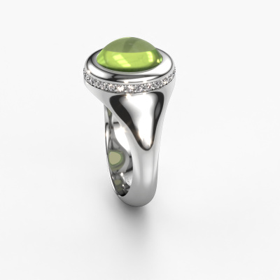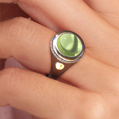 In this photo the platinum Lesli RND ring is set with a cabochon peridot. Cabochon means a peridot is shaped first, not faceted, into a specific shape, such as a drop, heart or round cabochon. Subsequently, it is polished until the gemstone has a orb shaped surface. A cabochon gemstone is a stunning, classy eye-catcher that matches perfectly with a contemporary as well as a vintage style. Our expert goldsmiths shape the beautiful ring to perfection which makes it unique. The cabochon peridot is set so its unique qualities are strengthened. The best part of this beautiful ring is that you can customize it to your own liking. Your style, your choice, your ring. On top of that, your modern platinum ring will be made by hand with eco-friendly materials! Please feel free to easily customize the ring, using our online tool.After receiving your order, our goldsmiths will passionately start the creative process of making your ring in our own studio. Because we don't have a big stockpile, these costs will not be passed on to you. Our pricing is proof of that! We offer top quality jewels at lowest price, guaranteed.To make it easier for you, we offer a 30 day return policy. Check our terms and conditions.