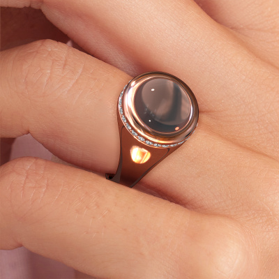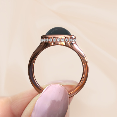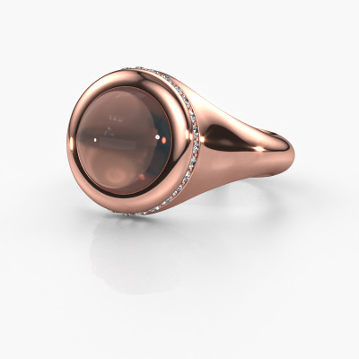 In this photo the rose gold Lesli RND ring is set with a cabochon smokey quartz. Cabochon means a smokey quartz is shaped first, not faceted, into a specific shape, such as a drop, heart or round cabochon. Subsequently, it is polished until the gemstone has a orb shaped surface. A cabochon gemstone is a stunning, classy eye-catcher that matches perfectly with a contemporary as well as a vintage style. Our expert goldsmiths shape the beautiful ring to perfection which makes it unique. The cabochon smokey quartz is set so its unique qualities are strengthened. The best part of this beautiful ring is that you can customize it to your own liking. Your style, your choice, your ring. On top of that, your modern rose gold ring will be made by hand with eco-friendly materials! Please feel free to easily customize the ring, using our online tool.After receiving your order, our goldsmiths will passionately start the creative process of making your ring in our own studio. Because we don't have a big stockpile, these costs will not be passed on to you. Our pricing is proof of that! We offer top quality jewels at lowest price, guaranteed.To make it easier for you, we offer a 30 day return policy. Check our terms and conditions.