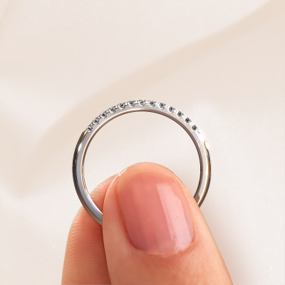 This SR10B6H stackable ring in 14 Carat white gold is set with diamond. This white gold stacked SR10B6H ring is the perfect addition to your ring collection! As the name suggests, it is a ring which can be combined on one finger with another ring. It gives you the opportunity to create your own style. A stacked ring usually represents a certain memory of someone special or a memorable moment. It is common to combine a stacked ring, representing an anniversary, with a wedding ring. But this affordable ring, combined with your other rings, also makes a classy fashion item. The affordable SR10B6H stackable ring, as shown here, can be customized to your liking. Our online tool offers many different options but please feel free to contact us if you want changes made to your SR10B6H stackable ring, which are unavailable in our online tool.After receiving your order, our goldsmiths will passionately start the creative process of making your ring in our own studio. Because we don't have a big stockpile, these costs will not be passed on to you. Our pricing is proof of that! We offer top quality jewels at lowest price, guaranteed.To make it easier for you, we offer a 30 day return policy. Check our terms and conditions.