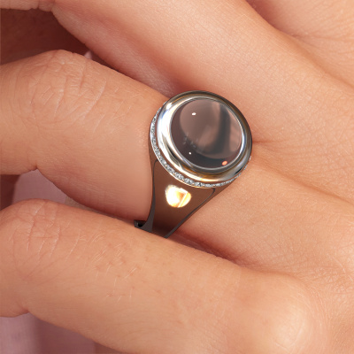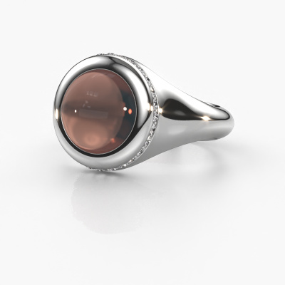 In this photo the white gold Lesli RND ring is set with a cabochon smokey quartz. Cabochon means a smokey quartz is shaped first, not faceted, into a specific shape, such as a drop, heart or round cabochon. Subsequently, it is polished until the gemstone has a orb shaped surface. A cabochon gemstone is a stunning, classy eye-catcher that matches perfectly with a contemporary as well as a vintage style. Our expert goldsmiths shape the beautiful ring to perfection which makes it unique. The cabochon smokey quartz is set so its unique qualities are strengthened. The best part of this beautiful ring is that you can customize it to your own liking. Your style, your choice, your ring. On top of that, your modern white gold ring will be made by hand with eco-friendly materials! Please feel free to easily customize the ring, using our online tool.After receiving your order, our goldsmiths will passionately start the creative process of making your ring in our own studio. Because we don't have a big stockpile, these costs will not be passed on to you. Our pricing is proof of that! We offer top quality jewels at lowest price, guaranteed.To make it easier for you, we offer a 30 day return policy. Check our terms and conditions.