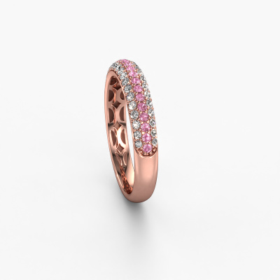 This Emely 2 ring in 14 Carat rose gold is set with pink sapphire. This rose gold stacked Emely 2 ring is the perfect addition to your ring collection! As the name suggests, it is a ring which can be combined on one finger with another ring. It gives you the opportunity to create your own style. A stacked ring usually represents a certain memory of someone special or a memorable moment. It is common to combine a stacked ring, representing an anniversary, with a wedding ring. But this pavé set ring, combined with your other rings, also makes a classy fashion item. How do you like this modern rose gold ring? Simply customize this Emely 2 ring, using our online tool. Subsequently, your personal pavé set Emely 2 ring will be made by hand by our goldsmiths. Precious metals and gemstones can be customized to your liking. Do you have specific preferences which are unavailable in our online tool? Please feel free to contact us. We will customize your personal modern ring to your liking.After receiving your order, our goldsmiths will passionately start the creative process of making your ring in our own studio. Because we don't have a big stockpile, these costs will not be passed on to you. Our pricing is proof of that! We offer top quality jewels at lowest price, guaranteed.To make it easier for you, we offer a 30 day return policy. Check our terms and conditions.