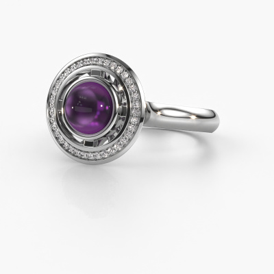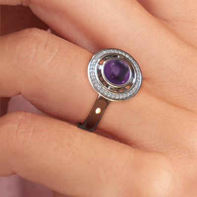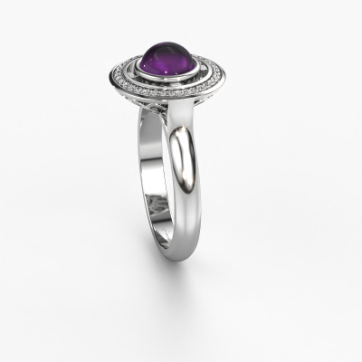 In this photo the platinum Salima ring is set with a cabochon amethyst. Cabochon means a amethyst is shaped first, not faceted, into a specific shape, such as a drop, heart or round cabochon. Subsequently, it is polished until the gemstone has a orb shaped surface. A cabochon gemstone is a stunning, classy eye-catcher that matches perfectly with a contemporary as well as a vintage style. Our expert goldsmiths shape the special ring to perfection which makes it unique. The cabochon amethyst is set so its unique qualities are strengthened. How do you like this design platinum ring? Simply customize this Salima ring, using our online tool. Subsequently, your personal special Salima ring will be made by hand by our goldsmiths. Precious metals and gemstones can be customized to your liking. Do you have specific preferences which are unavailable in our online tool? Please feel free to contact us. We will customize your personal design ring to your liking.After receiving your order, our goldsmiths will passionately start the creative process of making your ring in our own studio. Because we don't have a big stockpile, these costs will not be passed on to you. Our pricing is proof of that! We offer top quality jewels at lowest price, guaranteed.To make it easier for you, we offer a 30 day return policy. Check our terms and conditions.