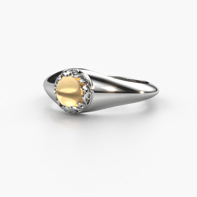 In this photo the platinum Birgit ring is set with a cabochon citrin. Cabochon means a citrin is shaped first, not faceted, into a specific shape, such as a drop, heart or round cabochon. Subsequently, it is polished until the gemstone has a orb shaped surface. A cabochon gemstone is a stunning, classy eye-catcher that matches perfectly with a contemporary as well as a vintage style. Our expert goldsmiths shape the royal ring to perfection which makes it unique. The cabochon citrin is set so its unique qualities are strengthened. The royal Birgit ring, as shown here, can be customized to your liking. Our online tool offers many different options but please feel free to contact us if you want changes made to your Birgit ring, which are unavailable in our online tool.Because we design and deliver our own rings, we can offer you a ring at a price you won't find anywhere else. A ring is made to order, which helps prevent excess supplies, so we can make you a great price offer. We understand it feels risky, buying your ring online, but we will gladly assist in the designing process, taking your budget into consideration.To make it easier for you, we offer a 30 day return policy. Check our terms and conditions.