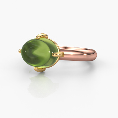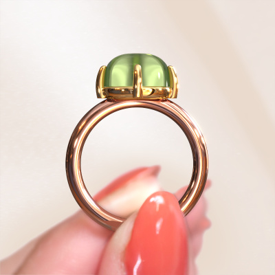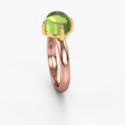 In this photo the rose gold Melodee ring is set with a cabochon peridot. Cabochon means a peridot is shaped first, not faceted, into a specific shape, such as a drop, heart or oval cabochon. Subsequently, it is polished until the gemstone has a orb shaped surface. A cabochon gemstone is a stunning, classy eye-catcher that matches perfectly with a contemporary as well as a vintage style. Our expert goldsmiths shape the charming ring to perfection which makes it unique. The cabochon peridot is set so its unique qualities are strengthened. Our goldsmiths passionately create your customized ring to your liking with the utmost care. The rose gold ring, as shown here, can be customized using our online tool. Feel free to ask our jewel designers for assistance if you want changes made which are unavailable in our online tool. We are happy to answer your questions.After receiving your order, our goldsmiths will passionately start the creative process of making your ring in our own studio. Because we don't have a big stockpile, these costs will not be passed on to you. Our pricing is proof of that! We offer top quality jewels at lowest price, guaranteed.To make it easier for you, we offer a 30 day return policy. Check our terms and conditions.