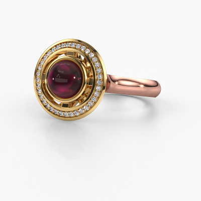 In this photo the rose gold Salima ring is set with a cabochon garnet. Cabochon means a garnet is shaped first, not faceted, into a specific shape, such as a drop, heart or round cabochon. Subsequently, it is polished until the gemstone has a orb shaped surface. A cabochon gemstone is a stunning, classy eye-catcher that matches perfectly with a contemporary as well as a vintage style. Our expert goldsmiths shape the special ring to perfection which makes it unique. The cabochon garnet is set so its unique qualities are strengthened. How do you like this design rose gold ring? Simply customize this Salima ring, using our online tool. Subsequently, your personal special Salima ring will be made by hand by our goldsmiths. Precious metals and gemstones can be customized to your liking. Do you have specific preferences which are unavailable in our online tool? Please feel free to contact us. We will customize your personal design ring to your liking.After receiving your order, our goldsmiths will passionately start the creative process of making your ring in our own studio. Because we don't have a big stockpile, these costs will not be passed on to you. Our pricing is proof of that! We offer top quality jewels at lowest price, guaranteed.To make it easier for you, we offer a 30 day return policy. Check our terms and conditions.