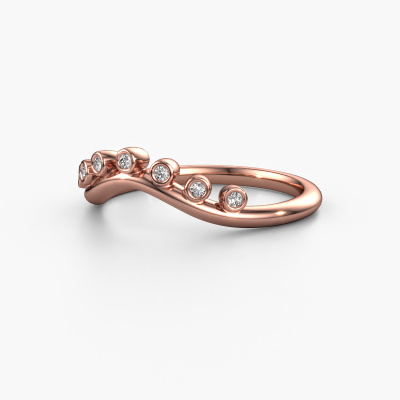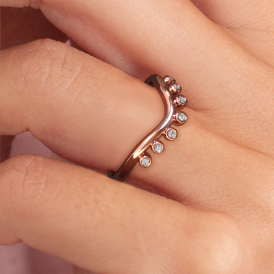 This Drop A stacking ring in 14 Carat rose gold is set with diamond. This rose gold stacked Drop A ring is the perfect addition to your ring collection! As the name suggests, it is a ring which can be combined on one finger with another ring. It gives you the opportunity to create your own style. A stacked ring usually represents a certain memory of someone special or a memorable moment. It is common to combine a stacked ring, representing an anniversary, with a wedding ring. But this narrow ring, combined with your other rings, also makes a classy fashion item. The narrow Drop A stacking ring, as shown here, can be customized to your liking. Our online tool offers many different options but please feel free to contact us if you want changes made to your Drop A stacking ring, which are unavailable in our online tool.After receiving your order, our goldsmiths will passionately start the creative process of making your ring in our own studio. Because we don't have a big stockpile, these costs will not be passed on to you. Our pricing is proof of that! We offer top quality jewels at lowest price, guaranteed.To make it easier for you, we offer a 30 day return policy. Check our terms and conditions.