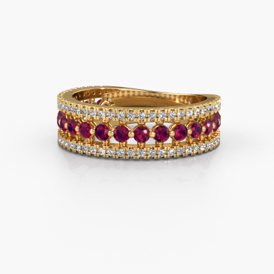 This exclusive gold Elizbeth 1 ring is a true work of art! This ring is made of 14 Carat gold and is set with 2 mm round rhodolite. The smallest ornaments are crafted by our goldsmith with a lot of patience and great passion. In order to create this ring with great precision, this craft requires a keen eye and a skillful hand. A challenge which ignites a fire in our expert goldsmiths. The exquisite rhodolite are set in a way that their unique qualities are strengthened. This gives the ring an even more glamorous appearance. The ring is unique by itself though, because of the natural birthstones we selected especially for this Elizbeth 1 ring. And by choosing the precious metal yourself, you create a unique ring. The best part of this sparkling ring is that you can customize it to your own liking. Your style, your choice, your ring. On top of that, your vintage gold ring will be made by hand with eco-friendly materials! Please feel free to easily customize the ring, using our online tool.By using a combination of the latest modern techniques, combined with ancient crafting, we can make all our rings in our own studio. Each jewel is made to order. This is advantageous because we can offer you a price you won't find anywhere else.To make it easier for you, we offer a 30 day return policy. Check our terms and conditions.