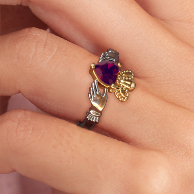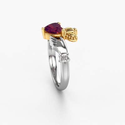 This Irish Claddagh ring is a sign of love set with a heart rhodolite. It is a remarkable, symbolic ring in which a crowned heart, held by two hands, is shown. The heart of a Claddagh ring is a symbol of love, the hands represent friendship and the crown, loyalty. A beautiful piece of jewelry to either give or receive! This symbolic 14 Carat white gold Claddagh 2 ring is made by hand in our own studio by our expert goldsmiths. The symbolic Claddagh 2 ring, as shown here, can be customized to your liking. Our online tool offers many different options but please feel free to contact us if you want changes made to your Claddagh 2 ring, which are unavailable in our online tool.After receiving your order, our goldsmiths will start the creative process of making your Claddagh 2 ring. We don't keep stock. This is advantageous because these costs will not be passed on to you. Therefore, we can offer jewelry at exceptionally low prices.To make it easier for you, we offer a 30 day return policy. Check our terms and conditions.