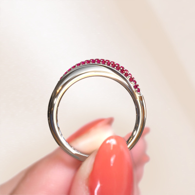 This pave set ring is called Rosie. This 14 Carat white gold ring is set with ruby 0.9 mm. The band of this white gold ring is set with rows of ruby which seem to have no beginning nor end. Our goldsmith carefully selects the gemstones and sets them with the utmost precision. For maximum shine, the ruby have to align perfectly. While artfully crafting and polishing the jewelry, light fall is constantly monitored, until the expert goldsmith is satisfied with the result. Designed by you, created especially for you!How do you like this modern white gold ring? Simply customize this Rosie ring, using our online tool. Subsequently, your personal twist Rosie ring will be made by hand by our goldsmiths. Precious metals and gemstones can be customized to your liking. Do you have specific preferences which are unavailable in our online tool? Please feel free to contact us. We will customize your personal modern ring to your liking.Are you on a budget? Please feel free to contact us, so we can go discuss your options. We offer our rings at guaranteed best price, because we make them to order. You won't find such a price anywhere else!To make it easier for you, we offer a 30 day return policy. Check our terms and conditions.