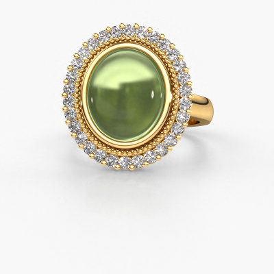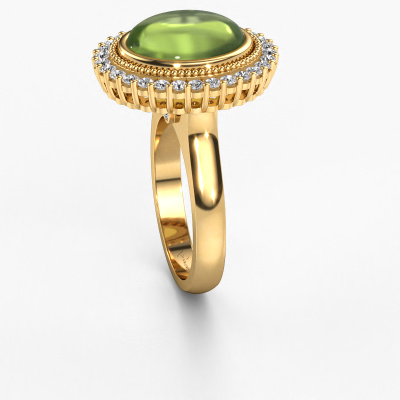 In this photo the gold Mila ring is set with a cabochon peridot. Cabochon means a peridot is shaped first, not faceted, into a specific shape, such as a drop, heart or oval cabochon. Subsequently, it is polished until the gemstone has a orb shaped surface. A cabochon gemstone is a stunning, classy eye-catcher that matches perfectly with a contemporary as well as a vintage style. Our expert goldsmiths shape the cluster ring to perfection which makes it unique. The cabochon peridot is set so its unique qualities are strengthened. Our goldsmiths passionately create your customized ring to your liking with the utmost care. The gold ring, as shown here, can be customized using our online tool. Feel free to ask our jewel designers for assistance if you want changes made which are unavailable in our online tool. We are happy to answer your questions.By using a combination of the latest modern techniques, combined with ancient crafting, we can make all our rings in our own studio. Each jewel is made to order. This is advantageous because we can offer you a price you won't find anywhere else.To make it easier for you, we offer a 30 day return policy. Check our terms and conditions.
