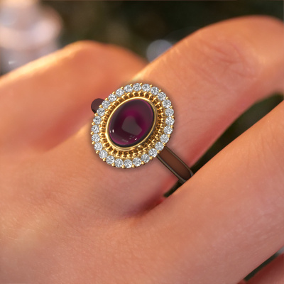 The ring shown above is called the Maartje. We call this type of ring a cluster ring, the center gemstone is surrounded by smaller sized stones. This 14 Carat white gold version is set with a 8x6 mm oval cabochon garnet center stone, embraced by smaller diamonds. If you look at this white gold cluster ring, you might get the impression that its smaller sized stones collide with the bigger garnet, so it is shaped like a flower. Therefore this ring is also known as the flower ring. Our artisan Goldsmiths get the job done. Each individual stone is carefully set by hand. During manufacturing, light fall is constantly monitored to make sure the special cluster effect is still visible. In the end you get the perfect ring with a radiant garnet gemstone centerpiece. You can imagine the effect of a ring of such significance when you give tot the love of your life on her special day to shine. After receiving your order, our goldsmiths will passionately start the creative process of making your ring in our own studio. Because we don't have a big stockpile, these costs will not be passed on to you. Our pricing is proof of that! We offer top quality jewels at lowest price, guaranteed.Our team of talented, passionate designers add new ring designs to our online collection daily. Our objective in doing so, is to be able to offer you a wide variety of jewels. Please feel free to request a quote if you have specific wishes for your ring. We guarantee to make you an offer you can't refuse.To make it easier for you, we offer a 30 day return policy. Check our terms and conditions.