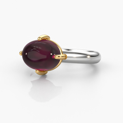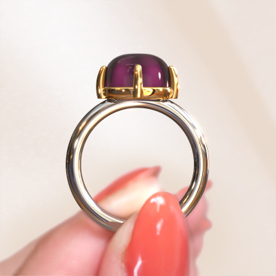 In this photo the white gold Melodee ring is set with a cabochon rhodolite. Cabochon means a rhodolite is shaped first, not faceted, into a specific shape, such as a drop, heart or oval cabochon. Subsequently, it is polished until the gemstone has a orb shaped surface. A cabochon gemstone is a stunning, classy eye-catcher that matches perfectly with a contemporary as well as a vintage style. Our expert goldsmiths shape the charming ring to perfection which makes it unique. The cabochon rhodolite is set so its unique qualities are strengthened. Our goldsmiths passionately create your customized ring to your liking with the utmost care. The white gold ring, as shown here, can be customized using our online tool. Feel free to ask our jewel designers for assistance if you want changes made which are unavailable in our online tool. We are happy to answer your questions.After receiving your order, our goldsmiths will passionately start the creative process of making your ring in our own studio. Because we don't have a big stockpile, these costs will not be passed on to you. Our pricing is proof of that! We offer top quality jewels at lowest price, guaranteed.To make it easier for you, we offer a 30 day return policy. Check our terms and conditions.