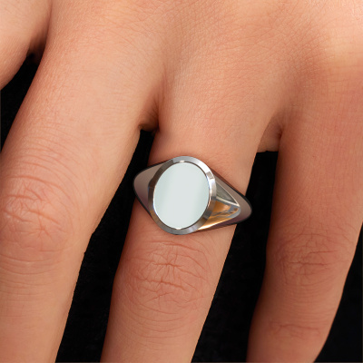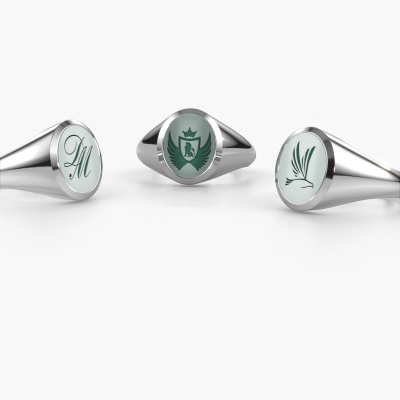 This white gold women´s signet ring is a true work of art! This is our elegant Evon 2 signet ring and it is set with a oval shape green sardonyx. In our crafting studio, we use a combination of the latest techniques and ancient traditional craftsmanship, so we are able to create a detailed perfect signet ring. Our expert goldsmiths are fascinated by signet rings. The signet ring can be engraved with initials or a family weapon. Signet rings with family weapons can be handed down from generation to generation and that usually is the case. On top of that, a signet ring is a beautiful, classy piece of jewelry which is trending once more. More than one reason to start or extend the tradition. Please browse our online database for more options on engravings. You can find the departments of our education center at the bottom of this page. The best part of this elegant signet ring is that you can customize it to your own liking. Your style, your choice, your signet ring. On top of that, your modern white gold signet ring will be made by hand with eco-friendly materials! Please feel free to easily customize the ring, using our online tool.After receiving your order, our goldsmiths will passionately start the creative process of making your ring in our own studio. Because we don't have a big stockpile, these costs will not be passed on to you. Our pricing is proof of that! We offer top quality jewels at lowest price, guaranteed.To make it easier for you, we offer a 30 day return policy. Check our terms and conditions.