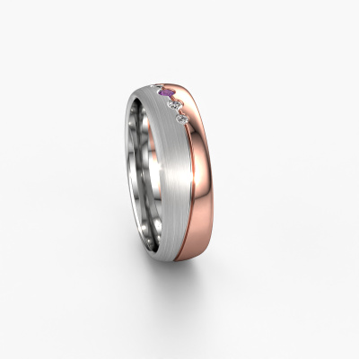 What a perfect combination of two different precious metals. They seem to reinforce each other in the luxury design of this ring! Our goldsmith would be honored to create a unique ring for you, customized to your liking. Each ladies wedding ring we offer is artfully crafted by hand in our own artisan studio. That makes it possible for us to turn luxury into reality and helps create your own personal ring, customized to your style. This luxury WH0925L36APM ladies wedding ring is set with round amethyst, is ±0.24 in (6 mm) wide and has a mat/shiny finish. You can choose the combination of precious metals of your preference in our online tool. Anything goes! It is wise to browse through the characteristics of each different precious metal. For example, gold and silver are softer metals. Carat is determined by the amount of added extra metals. If the goldsmith doesn't add a lot, carat is higher and the wedding ring will be softer. If he adds more metals, the jewel has a lower amount of carat. A softer precious metal can still be used for your luxury wedding ring! If you prefer a precious metal which will last a lifetime, we recommend platinum. This is the most solid and durable metal our goldsmith uses.This wedding ring can also serve as a source of inspiration. Would you like the ring to have a matte or shiny finish (at no additional cost), or would you prefer it to be wider or narrower? Anything is possible. Because there are countless variations, we can’t show everything on our website. Do you have an idea for beautiful wedding rings, or have you seen a stunning set of wedding rings elsewhere? Feel free to contact us; our designers are ready to assist you.Because we design and deliver our own wedding rings, we can offer you wedding rings at a price you won't find anywhere else. A ring is made to order, which helps prevent excess supplies, so we can make you a great price offer.To make it easier for you, we offer a 30 day return policy. Check our terms and conditions.
