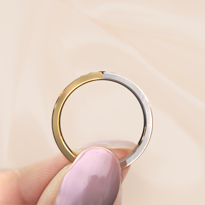 A unique ladies wedding ring, especially designed by our own jewel designers. An unusual ring that matches each style. This contemporary wedding ring WH1101L15SAM is made by hand by our goldsmiths in our own crafting studio. By using a combination of the most modern techniques and ancient craftsmanship, your WH1101L15SAM ring is created to perfection. This ladies wedding ring has an ±0.20 in (5 mm) width and has a shiny finish. Here, the contemporary gold wedding ring is shown in the combination gold with white gold. An exquisite wedding ring, a celebration of your wedding day!After ordering your wedding ring, our goldsmith will start creating your wedding ring immediately. Did you know we use the latest modern techniques, combined with ancient craftsmanship? This helps to create a 3D design of your jewel. You can order a dummy ring, if you please. This way you can check if the wedding ring meets your standard. Then, our goldsmith, who strives for perfection, will create your ring in our own artisan studio completely by hand. We feel passionate creating a unique ring each time. One which is finished to perfection. In the end, you get a wedding ring which matches your wishes.Do you have specific wishes? Like a shiny ring, or a matte one? A wider band, or a smaller one? The possibilities of this wedding ring are endless. Be sure to contact our designers to adjust your ring to your personal taste. Did you see a ring somewhere, or do you have some special ideas of your own? Then don't hesitate to contact our designers and discuss your ideas for your own set of beautiful wedding rings. We are up for the challenge of creating the ring exactly the way you want it!After receiving your order, our goldsmiths will start the creative process of making your wedding rings. We don't keep stock. This is advantageous because these costs will not be passed on to you. Therefore, our quality wedding rings are always priced 30 percent lower than those of other jewelers.To make it easier for you, we offer a 30 day return policy. Check our terms and conditions.