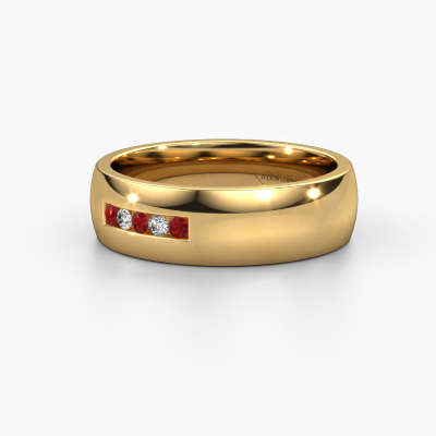 To create your ladies wedding ring in our artisan studio, we use the most modern techniques, combined with ancient craftsmanship. The end result is this modern WH0107L26BP wedding ring, which is crafted to perfection by hand by our goldsmiths. A ring that fills us with pride. This gold WH0107L26BP ladies wedding ring with court profile has an ±0.24 in (6 mm) width and has a shiny finish with ruby. Gold represents love and therefore our goldsmith loves using it in the design of your modern wedding ring. We are a proud member of the Responsible Jewellery Council. This means we only use eco-friendly gold. Something we take great pride in, obviously. It is also possible to use your own gold in the design of your wedding ring. Each jewel is made by hand in our own artisan studio so we can offer this option. This gives you the opportunity to add an extra personal touch to your ring. A ring with its own history!This wedding ring can also serve as a source of inspiration. Would you like the ring to have a matte or shiny finish (at no additional cost), or would you prefer it to be wider or narrower? Anything is possible. Because there are countless variations, we can’t show everything on our website. Do you have an idea for beautiful wedding rings, or have you seen a stunning set of wedding rings elsewhere? Feel free to contact us; our designers are ready to assist you.After receiving your order, our goldsmiths will start the creative process of making your wedding rings. We don't keep stock. This is advantageous because these costs will not be passed on to you. Therefore, our quality wedding rings are always priced 30 percent lower than those of other jewelers.To make it easier for you, we offer a 30 day return policy. Check our terms and conditions.
