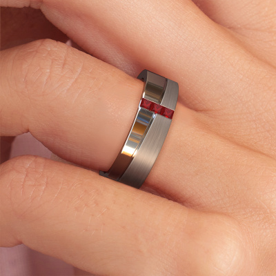 A unique two-tone platinum ladies wedding ring, designed by you, and then artfully crafted by our goldsmith in our own artisan studio! A beautiful symbol, reflecting your love, which you carry with you for a lifetime! Each ring we offer is artfully forged by hand in our own crafting studio. This makes it possible for us to create you a ring which is customized to your liking, completely mat/shiny your style. This modern WH0906L16A wedding ring is set with ruby, is ±0.24 in (6 mm) wide and has a mat/shiny finish. You can choose the combination of precious metals of your preference in our online tool. Anything goes! It is wise to browse through the characteristics of each different precious metal. For example, gold and silver are softer metals. Carat is determined by the amount of added extra metals. If the goldsmith doesn't add a lot, carat is higher and the wedding ring will be softer. If he adds more metals, the jewel has a lower amount of carat. A softer precious metal can still be used for your modern wedding ring! If you prefer a precious metal which will last a lifetime, we recommend platinum. This is the most solid and durable metal our goldsmith uses.Do you have special preferences regarding your wedding ring? For instance, a smaller or a wider band? Or perhaps a shiny or a matte ring? There are numerous variations possible. You can always discuss the possibilities with our jewelry designers. If you have certain wedding rings in mind, our designers will gladly help by drawing the rings of your dreams. Be sure to contact us!After receiving your order, our goldsmiths will start the creative process of making your wedding rings. We don't keep stock. This is advantageous because these costs will not be passed on to you. Therefore, our quality wedding rings are always priced 30 percent lower than those of other jewelers.To make it easier for you, we offer a 30 day return policy. Check our terms and conditions.
