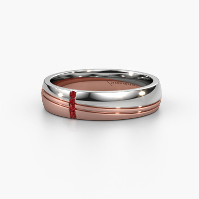 A unique two-tone rose gold ladies weddings ring, designed by you, and then artfully crafted by our goldsmith in our own artisan studio! A beautiful symbol, reflecting your love, which you carry with you for a lifetime! Each ring we offer is artfully forged by hand in our own crafting studio. This makes it possible for us to create you a ring which is customized to your liking, completely mat/shiny your style. This modern WH0909L25X weddings ring is set with ruby, is ±0.20 in (5 mm) wide and has a mat/shiny finish. Gold represents love and therefore our goldsmith loves using it in the design of your modern weddings ring. We are a proud member of the Responsible Jewellery Council. This means we only use eco-friendly gold. Something we take great pride in, obviously. It is also possible to use your own gold in the design of your weddings ring. Each jewel is made by hand in our own artisan studio so we can offer this option. This gives you the opportunity to add an extra personal touch to your ring. A ring with its own history!Do you have specific wishes regarding your weddings ring, but are you having difficulties finding the design on our website? The be sure to contact our designers! For instance, we can make the band smaller or wider. Do you prefer a matte finish? We can do that! Engravings are a great way of personalizing your rings, and applicable on most designs. Or, if you have an idea of your own for your extraordinary wedding rings, contact us! Our designers are up for the challenge of designing the ring of your dreams!After receiving your order, our goldsmiths will passionately start the creative process of making your wedding rings in our own artisan studio. Because we do not maintain a large stockpile, we can offer our jewelry at a lower price than other jewelers. Our pricing is proof of that! We offer top quality jewels at lowest price, guaranteed.To make it easier for you, we offer a 30 day return policy. Check our terms and conditions.
