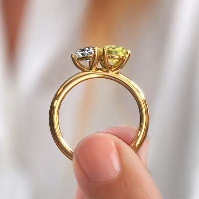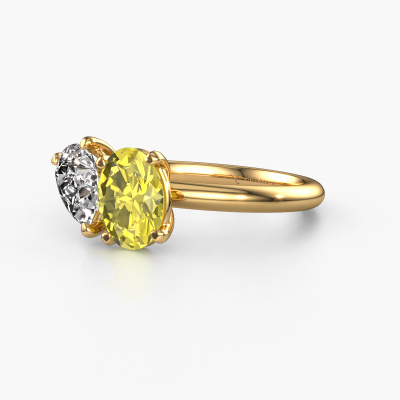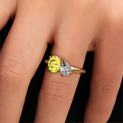 This 14 Carat gold ring is called Toi et Moi OVL-PER and is set with yellow lab grown diamond. Do you keep up with the latest fashion trends? Do you want a unique engagement ring that matches your lifestyle? This charming engagement ring is an extraordinary ring which can be custom made to fit your or her personal style. This fashionable gold engagement ring is set with yellow lab grown diamond. Our yellow lab grown diamonds are carefully selected for this specific ring in order to create the best effect. Our expert goldsmith will create your ring in our own artisan studio where the yellow lab grown diamond will be set with great care. The ring will then be polished to perfection. Nothing but the best for the love of your life! This jewel is made just for you by our master goldsmiths in our own studio.By using our modern techniques, we can design and customize the finest quality jewels with the utmost care for you. Our engagement rings are always priced 30 percent lower than other jewelers. We make engagement rings to order so we don't have to maintain a large stock. If you have a certain budget, we are more than happy to advice you accordingly.Do you have a specific ring in mind? One you came across somewhere. Please feel free to tell us your wishes and we will turn your design into a unique engagement ring. You can follow the development of your ring design because we use 3D drawings. This gives you a realistic preview of your design. We will gladly send you a non-binding offer, based on a fair price/ quality ratio. It will amaze you.To make it easier for you, we offer a 30 day return policy. Check our terms and conditions.