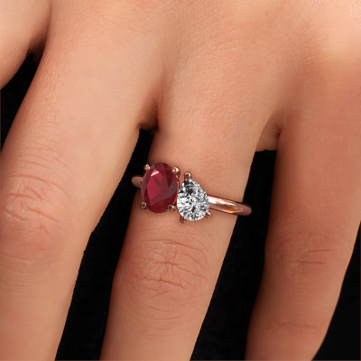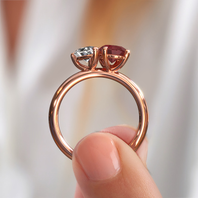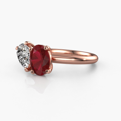 This 14 Carat rose gold ring is called Toi et Moi OVL-PER and is set with ruby. Do you keep up with the latest fashion trends? Do you want a unique engagement ring that matches your lifestyle? This charming engagement ring is an extraordinary ring which can be custom made to fit your or her personal style. This fashionable rose gold engagement ring is set with ruby. Our ruby are carefully selected for this specific ring in order to create the best effect. Our expert goldsmith will create your ring in our own artisan studio where the ruby will be set with great care. The ring will then be polished to perfection. Nothing but the best for the love of your life! This jewel is made just for you by our master goldsmiths in our own studio.By using our modern techniques, we can design and customize the finest quality jewels with the utmost care for you. Our engagement rings are always priced 30 percent lower than other jewelers. We make engagement rings to order so we don't have to maintain a large stock. If you have a certain budget, we are more than happy to advice you accordingly.Do you have a specific ring in mind? One you came across somewhere. Please feel free to tell us your wishes and we will turn your design into a unique engagement ring. You can follow the development of your ring design because we use 3D drawings. This gives you a realistic preview of your design. We will gladly send you a non-binding offer, based on a fair price/ quality ratio. It will amaze you.To make it easier for you, we offer a 30 day return policy. Check our terms and conditions.