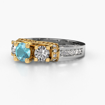 This 14 Carat white gold ring is called Phileine and is set with 5 mm blue topaz. This exclusive white gold 3-stone engagement ring is a true work of art! The ornaments are crafted with a lot of patience and great passion. In order to create this ring with great precision, this craft requires a keen eye and skillful hand. A challenge which ignites a fire in our expert goldsmith. The exquisite blue topaz are set in a special way so they stand out even more. This gives the ring an even more glamorous appearance. The daring engagement ring is actually unique on its own because of the gemstones which we carefully select especially for this ring. On top of that you select the precious metals which will be used to create a unique ring for the most extraordinary woman in your life! This jewel is made with passion and love by one of our master goldsmiths.After receiving your order, our goldsmiths will passionately start the creative process of making your engagement ring in our own studio. Because we don't have a big stockpile, these costs will not be passed on to you. Our pricing is proof of that! We offer top quality jewels at lowest price, guaranteed.Different styles of new rings are made daily by our team. Perhaps you have found a 3-stone engagement ring somewhere. One you would like to give to your loved one. Please feel free to share your thoughts and design with our jewel designers. We would love to turn your design into a exclusive engagement ring. You can follow the development of your ring design because we use very detailed 3D drawings. On top of that, you can order a dummy of the design. A dummy is a plastic ring, which can be shaped according your ring design. You can try it on and check if the engagement ring is up to standard. We will gladly send you a non-binding offer, based on a fair price/ quality ratio. The offer will baffle you, considering the quality of the ring and gemstones.To make it easier for you, we offer a 30 day return policy. Check our terms and conditions.