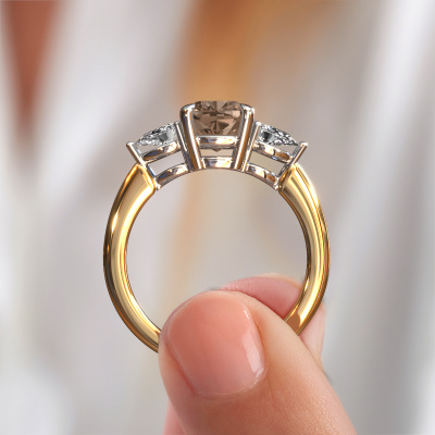 This 14 Carat gold ring is called Chanou CUS and is set with 2.70 crt brown diamond. This exclusive gold 3-stone engagement ring is a true work of art! The ornaments are crafted with a lot of patience and great passion. In order to create this ring with great precision, this craft requires a keen eye and skillful hand. A challenge which ignites a fire in our expert goldsmith. The exquisite brown diamonds are set in a special way so they stand out even more. This gives the ring an even more glamorous appearance. The pretty engagement ring is actually unique on its own because of the gemstones which we carefully select especially for this ring. On top of that you select the precious metals which will be used to create a unique ring for the most extraordinary woman in your life! This jewel is made to shine bright around your finger. Each jewel is hand made with love by our goldsmiths.After receiving your order, our goldsmiths will start the creative process of making your Chanou CUS engagement ring. We don't keep stock. This is advantageous because these costs will not be passed on to you. Therefore, we can offer jewelry at exceptionally low prices.Our designers and goldsmiths work together each day, creating new jewels. Perhaps you have found a nice exclusive engagement ring somewhere, which can be used to customize your unique ring. Please feel free to contact us. We will make you an offer, based on a fair price/ quality ratio, which will amaze you.To make it easier for you, we offer a 30 day return policy. Check our terms and conditions.