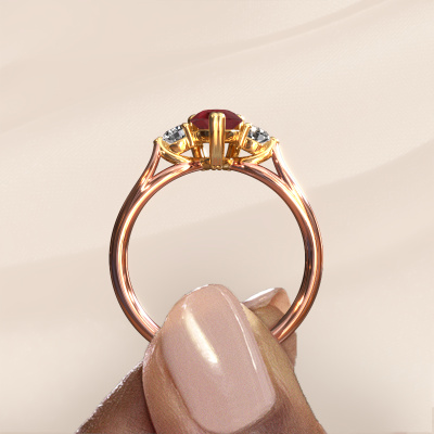 This 14 Carat rose gold ring is called Amie per and is set with 7x5 mm ruby. For you, there is only one person in your life who stands out in a crowd. Only one that makes your heart skip a beat. A true gem! She, above all others, deserves a special gift. A unique customized jewel made in her honor. We believe this ring is perfect for your special moment. Each detail of this exclusive rose gold 3-stone engagement ring is selected by hand, crafted and polished by our expert goldsmith in our own artisan studio. We strive to achieve the perfect design and composition of the ring, so it enhances the unique features of our ruby, and lets them shine even brighter. It takes a lot of precision to make but in the end it pays off because of the sheer beauty of the ring. And that is our main goal. It's what gets us excited. The great thing about our online tool is, that you can design your own jewelry into a unique, personalized piece. This unique special engagement ring is created with the precious metal combination of rose gold and gold. But of course you are completely free to select other colors. Each piece of jewelry is made by a team of passionate goldsmiths and jewel designers. This will make your crown jewel truly eye-catching.By using a combination of the latest modern techniques, combined with ancient crafting, we can make all our engagement rings in our own studio. Each jewel is made to order. This is advantageous because we can offer you a price you won't find anywhere else.Do you have a specific ring in mind? One you came across somewhere. Please feel free to tell us your wishes and we will turn your design into a unique engagement ring. You can follow the development of your ring design because we use 3D drawings. This gives you a realistic preview of your design. We will gladly send you a non-binding offer, based on a fair price/ quality ratio. It will amaze you.To make it easier for you, we offer a 30 day return policy. Check our terms and conditions.